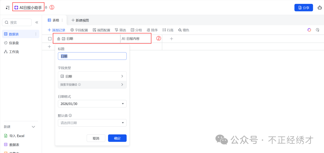 (2)重命名多维表格为AI日报小助手 ->新建两个表格字段日期 和日报内容(字段类型分别为日期和文本);
