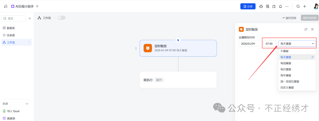 (4)点击白色方框选择定时触发->设置为7:00和每天重复;