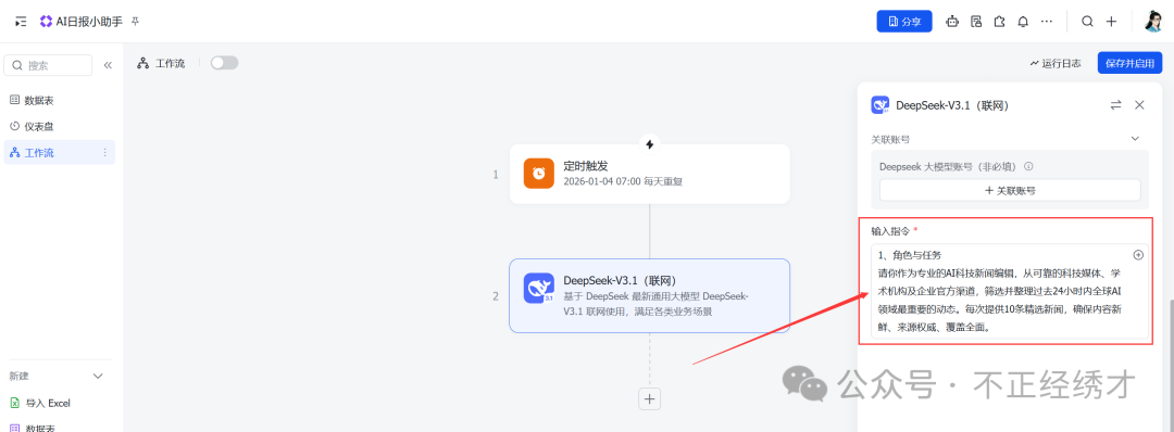 (5)点击就执行白色方框选择联网的DeepSeek->将提示词填入到输入指令中;