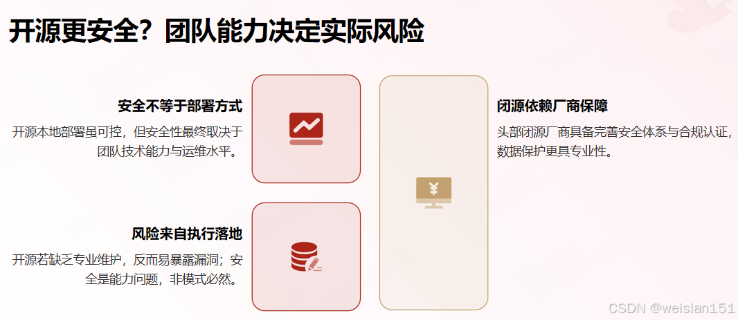真相:安全性不能一概而论。开源本地部署可控,但若团队能力不足,反而增加漏洞风险;闭源依赖厂商,但头部厂商安全体系更完善。