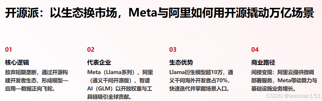代表:Meta(Llama)、阿里(通义千问开源版)、智谱AI(GLM)