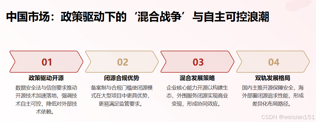 - 政策推力(利开源):自主可控、数据出境限制、信创要求