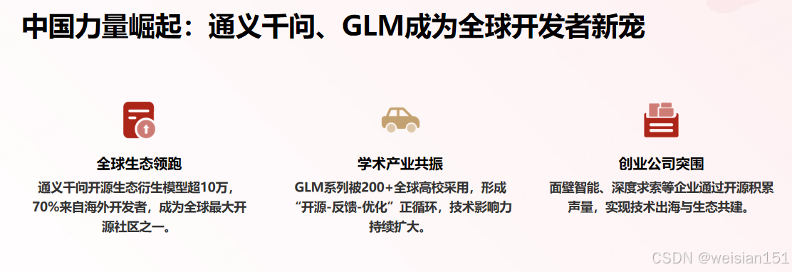 - 通义千问:2024年开源生态衍生模型突破10万个,成为全球最大开源模型社区,70%来自海外开发者
