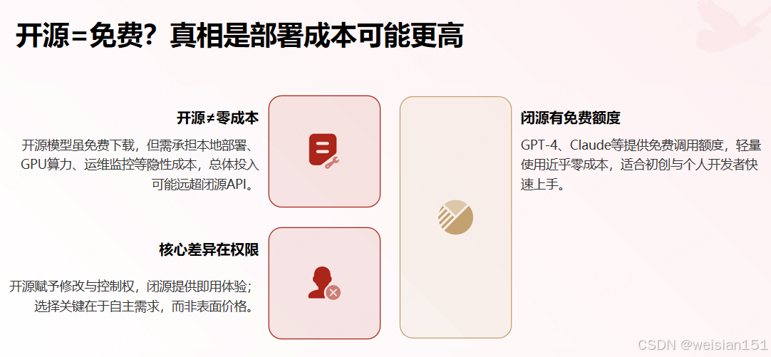真相 :开源有部署、运维、人力成本;闭源也有免费额度。核心区别是权限,而非价格。