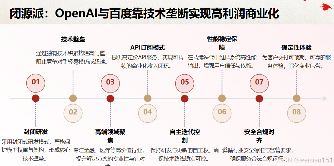一边是"技术保密"的实用主义,以OpenAI GPT系列、百度文心一言(早期)为代表,靠封闭迭代构建技术壁垒,垄断高端商业场景。