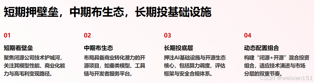 - 长期:投资AI基础设施和开源生态底层