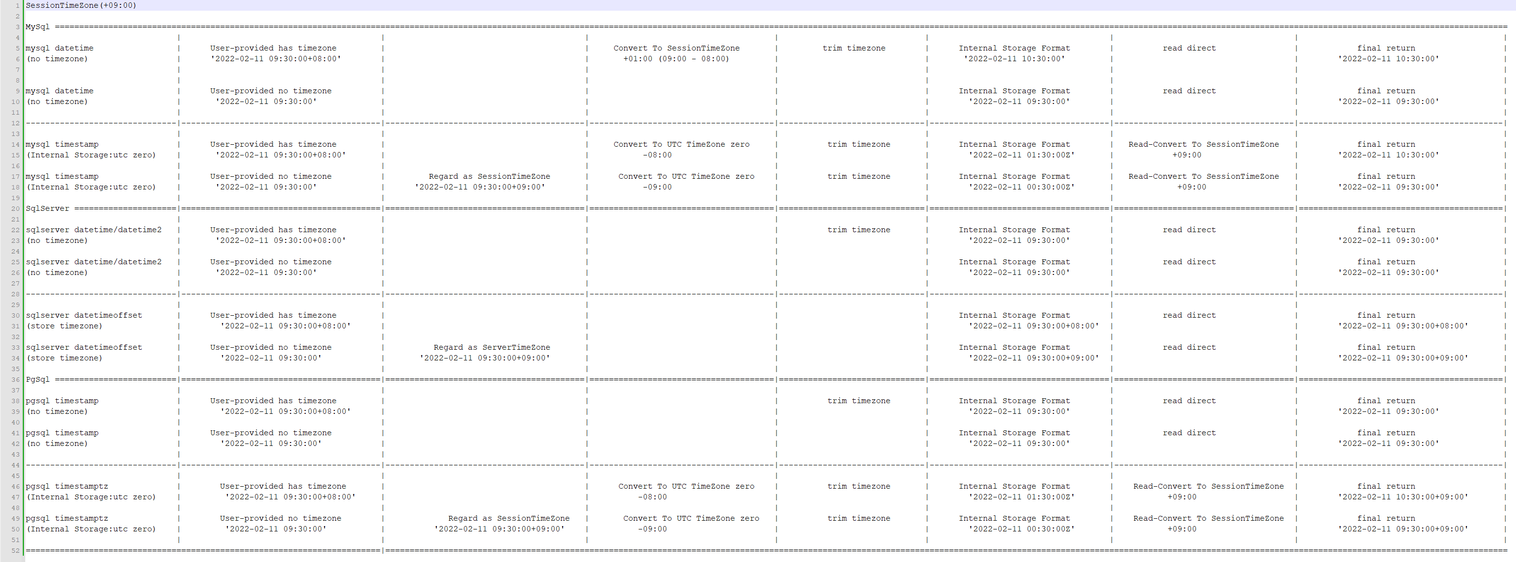 (Internal Storage:utc zero) | '2022-02-11 09:30:00+08:00' | | -08:00 | | '2022-02-11 01:30:00Z' | +09:00 | '2022-02-11 10:30:00+09:00' |