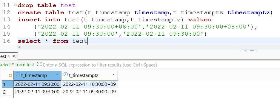 (no timezone) | '2022-02-11 09:30:00+08:00' | | | | '2022-02-11 09:30:00' | | '2022-02-11 09:30:00' |