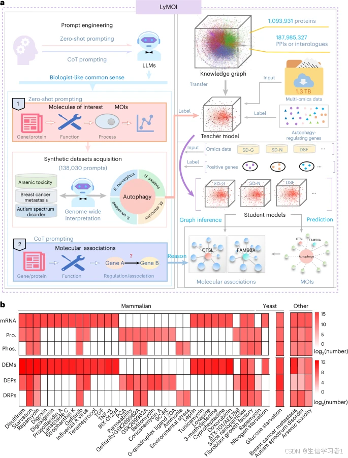 通过对海量组学数据进行分子全景分析,可以识别细胞中的调控网络,但还需要进行机制解读和实验验证。在此,我们结合深度学习和大型语言模型推理,开发了一种用于组学解读的混合工作流程,称为 LyMOI。LyMOI 采用了 GPT-3.5 来进行生物学知识推理,并使用了一个包含图卷积网络(GCN)的大型图模型。该大型图模型整合了进化上保守的蛋白质相互作用,并通过分层微调从多组学数据中预测特定环境下的分子调节因子。然后,GPT-3.5 生成机器的推理链(CoT),以机制上解读其在生物系统中的作用。以自噬为例,LyMOI 机制性地解读了 1.3TB 的转录组、蛋白质组和磷酸化蛋白质组数据,并扩展了对自噬调节因子的了解。我们还表明,LyMOI 重点突出了两种人类癌蛋白,CTSL 和 FAM98A,在使用抗肿瘤药物双硫仑(DSF)治疗时增强了自噬作用。在体外抑制这些基因会减弱 DSF 介导的自噬,并抑制癌细胞的增殖。令人惊讶的是,使用 Z-FY-CHO(一种此前用于预防 SARS-CoV-2 感染的 CTSL 特异性抑制剂)进行的 DSF 治疗,在体内显著抑制了肿瘤的生长。