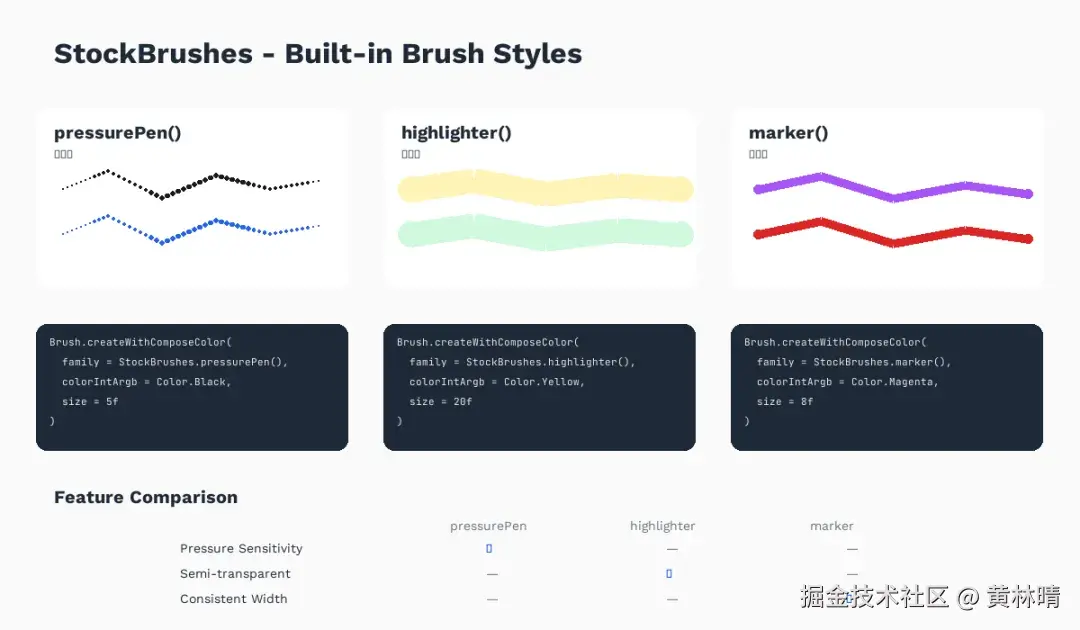 pressurePen()- 压感钢笔highlighter()- 荧光笔marker()- 马克笔pressure()- 通用压感笔