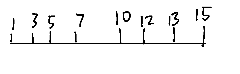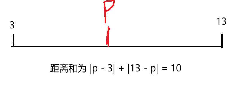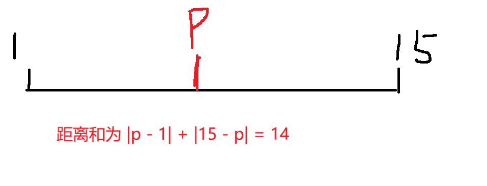 既然1和15的距离和得到了,我们再看3和13的距离和,只要货仓在3和13的中间,距离和就一定是定值10