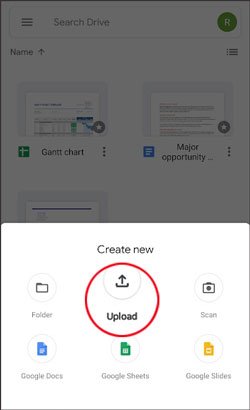 第 2 步: 使用 Gmail 帐户登录后,点击右下角的" + "按钮,然后选择"上传"选项。
