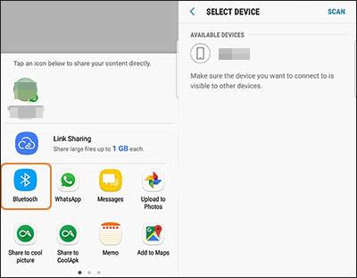 步骤3: 打开选项卡上的文件管理器,然后选择要备份到计算机的数据。点击"共享 "按钮并选择"蓝牙"和您的计算机设备将它们传输到计算机。