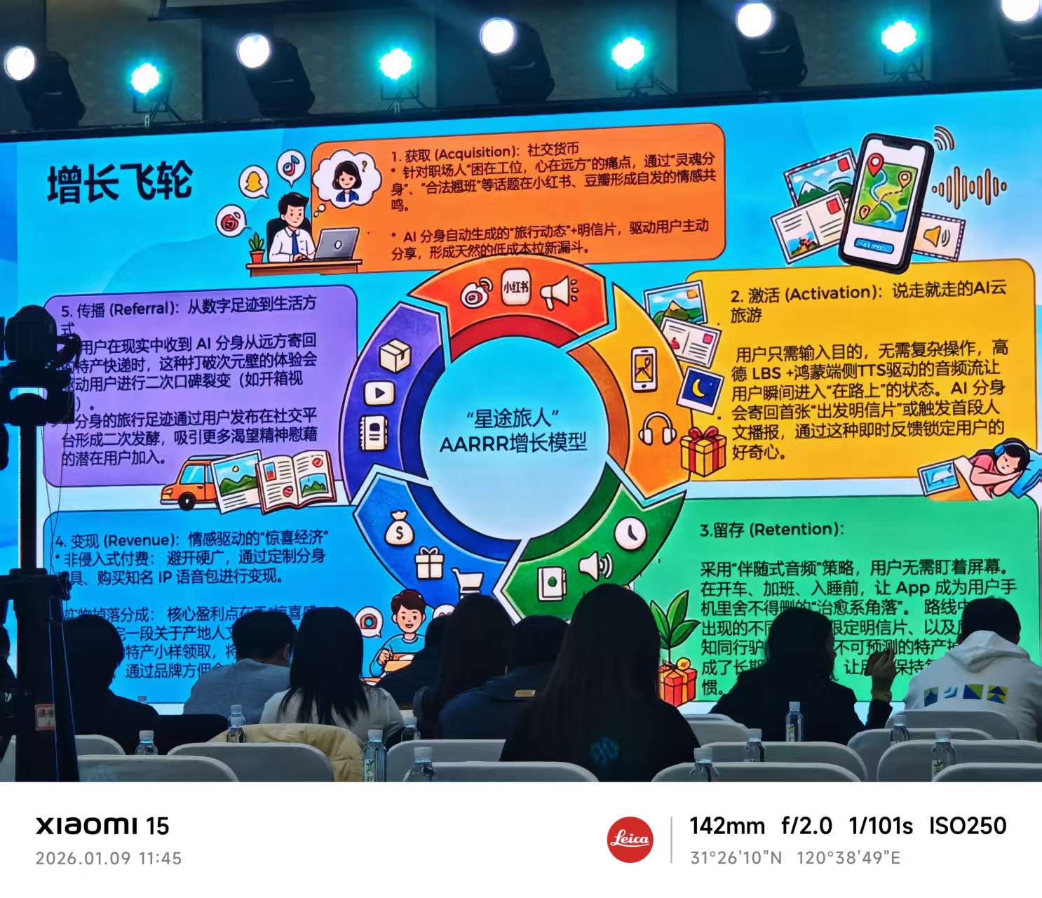"星途旅人"项目不仅在UI上表现出色,其背后的增长逻辑同样严密。演讲者通过一张清晰的"增长飞轮"模型图展示了产品的运营核心。这个模型通过闭环逻辑展示了业务增长的动力来源:通过优质的初始体验吸引用户,用户产生行为数据(如轨迹、打卡),数据反哺平台优化推荐算法或丰富内容生态,进而提升用户体验,吸引更多用户。这种将经典的互联网商业模型与LBS应用相结合的分析,显示了开发团队对于产品生命周期的深刻理解。在屏幕上,每一个环节都通过箭头紧密相连,逻辑推演严丝合缝。