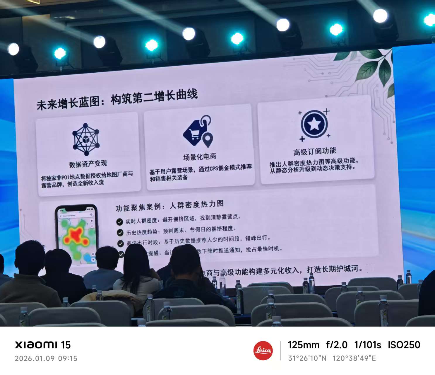 紧接着,该项目的负责人展示了未来的规划蓝图。这一页PPT详细阐述了项目从单一的定位工具向综合性户外服务平台转型的路径。规划中可能包含了从营地预订、周边生态(如水源、电源、卫生间)的数据补全,到用户社区的构建。这显示了开发者不仅具备技术实现能力,更拥有完整的产品思维,懂得如何利用地图API作为底层基座,通过叠加增值服务来构建商业闭环。