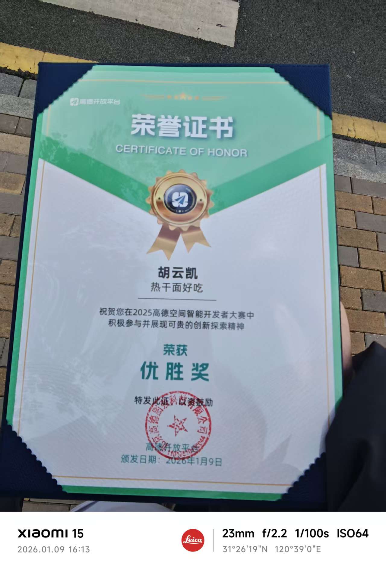 随着大会接近尾声,我也收获了属于自己的那份荣誉------优胜奖。虽然未能摘得桂冠,但站在高德开发者大会的舞台上,手持这本红色的荣誉证书,内心依然充满成就感。这张证书是对项目中技术架构合理性、代码质量以及创新思维的官方认证。它见证了在开发过程中无数次调试API、优化定位算法的日日夜夜。这不仅是一个奖项,更是一个新的起点,激励着在未来的开发道路上继续深耕LBS技术领域。