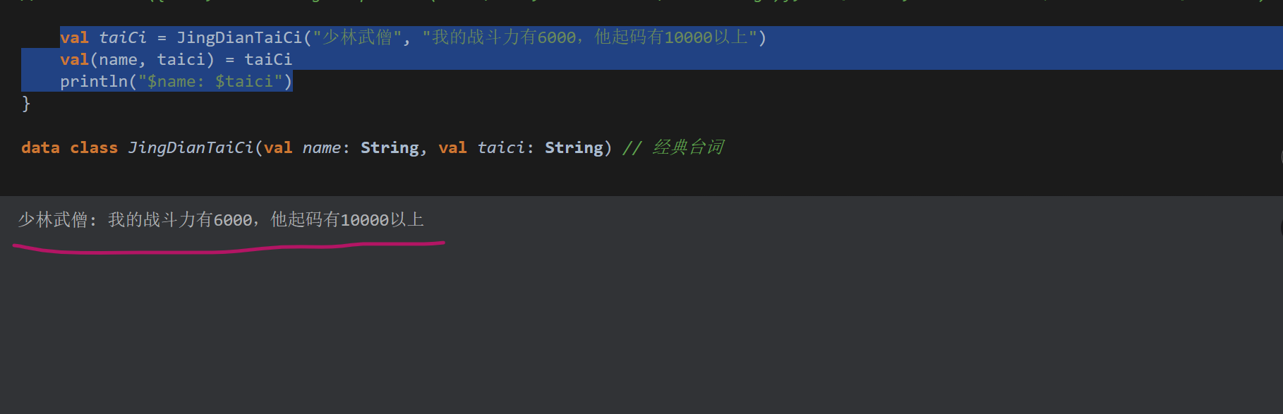 val taiCi = JingDianTaiCi("少林武僧", "我的战斗力有6000,他起码有10000以上")