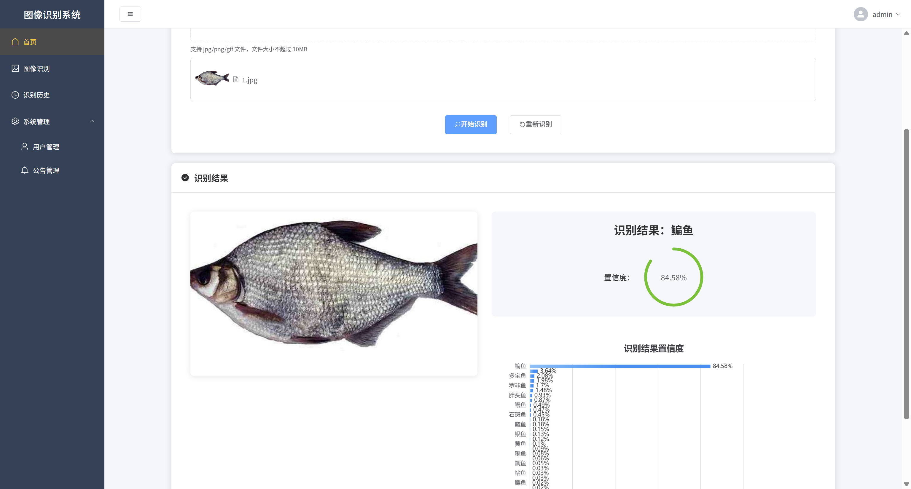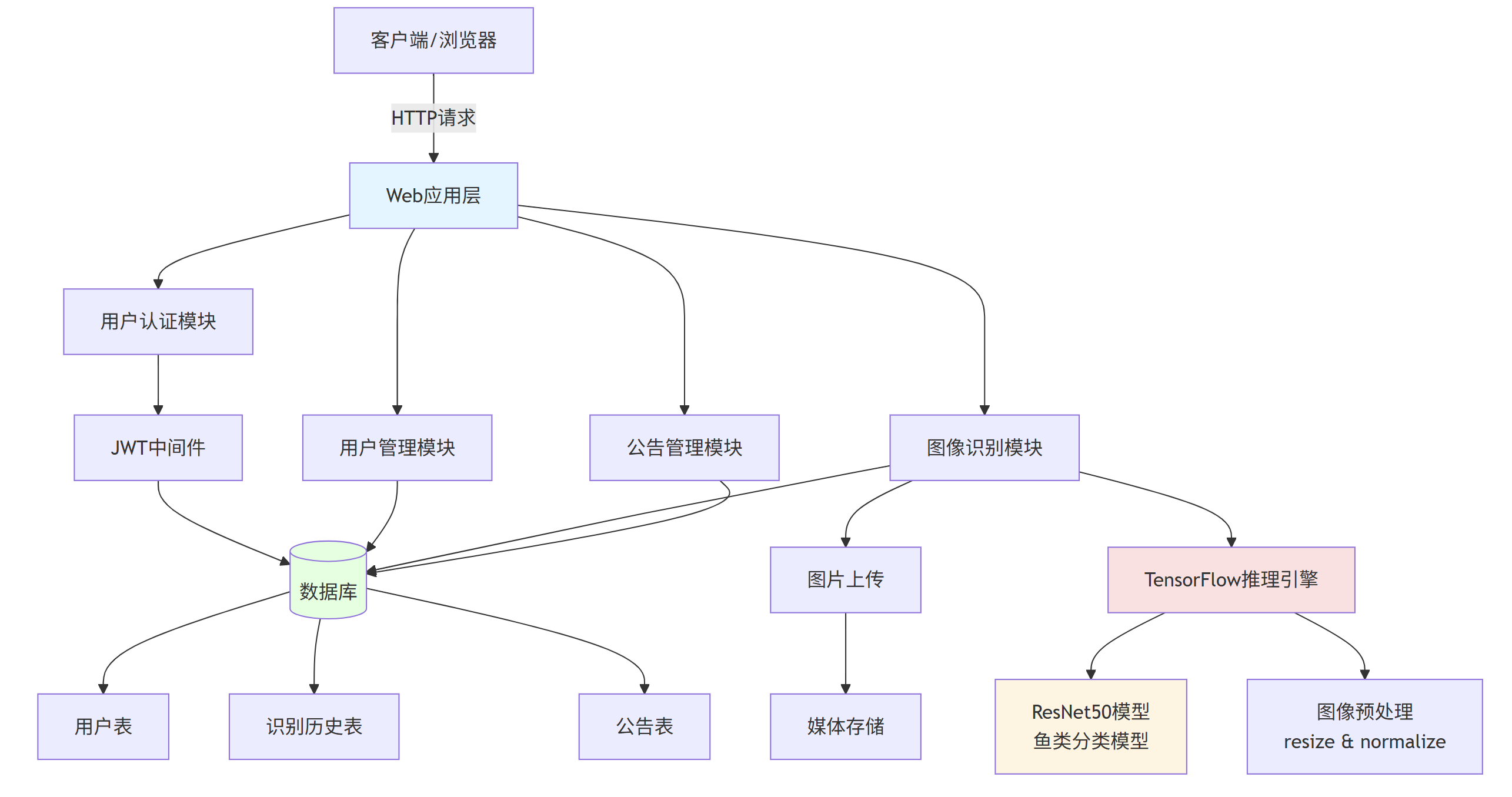 本项目基于深度学习技术设计并实现了一个智能鱼类识别系统。系统采用B/S架构,后端使用Python Flask框架构建RESTful API接口,前端实现图像上传与识别结果展示功能。系统核心利用TensorFlow深度学习框架,基于ResNet50卷积神经网络模型,实现了对30种常见鱼类的自动识别与分类,包括墨鱼、带鱼、石斑鱼、草鱼等。系统具备完整的用户管理功能,支持用户注册登录、身份验证(JWT)、图像上传识别、识别历史记录查询与管理等功能。通过本地图片存储和SQLite数据库管理系统数据,系统采用模块化设计思想,将用户认证、用户管理、图像识别、通知公告等功能独立封装,具有良好的可扩展性和维护性。