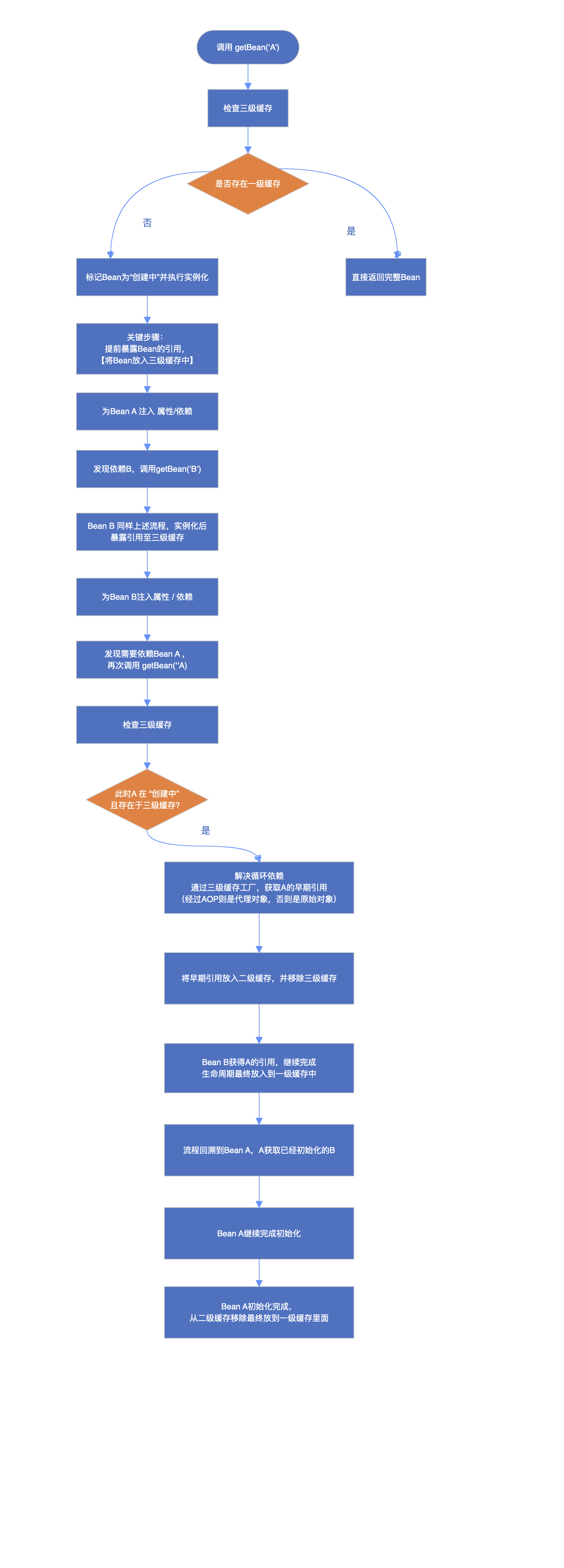 - 那么就需要Bean实例化后立即执行所有可能的AOP代理后处理逻辑来创建对象,这样违反了Bean生命周期的设计原则,而且对于没有循环依赖的Bean,这种"提前代理"是不必要的开销。