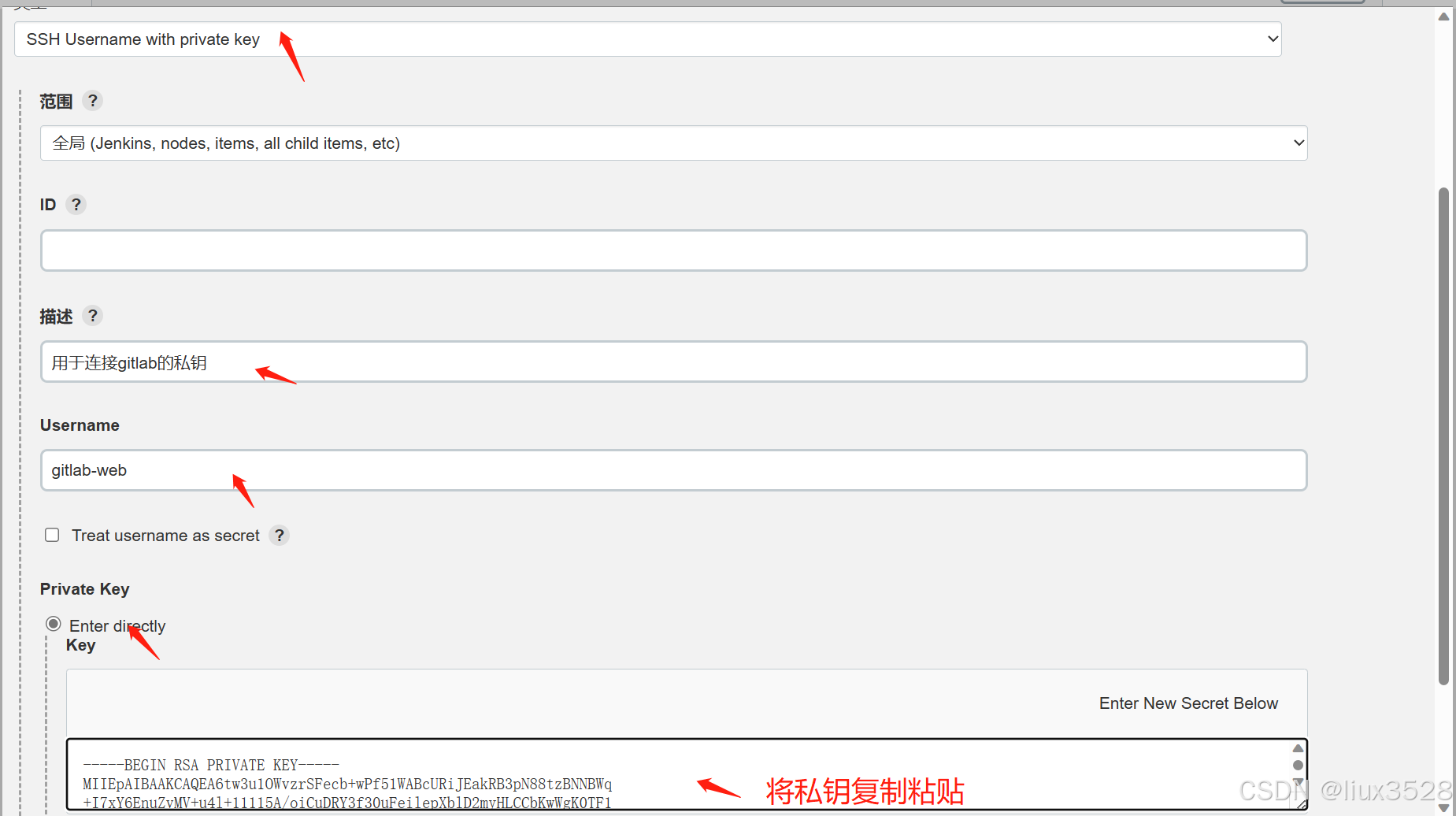 - 添加类型为 "SSH Username with private key" 的凭据,将生成的私钥内容粘贴进去。