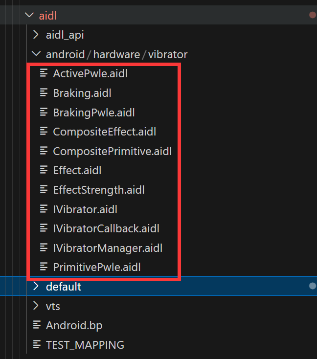 libvibratorexampleimpl 是一个静态库,包含了 Vibrator.cpp VibratorManager.cpp 源码。源码中主要是对 aidl hal 服务端对象的具体实现。