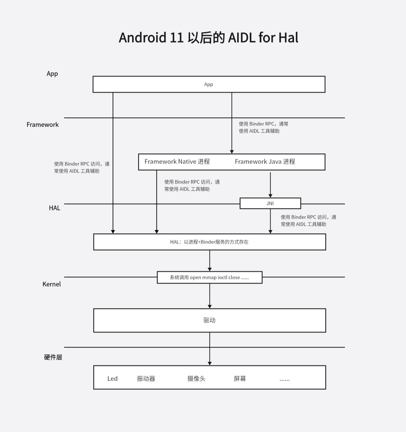 - ③ 特殊情况下,比如某个硬件只有一个 App 使用,App 可以直接通过 binder 通信访问到 hal binder 服务。