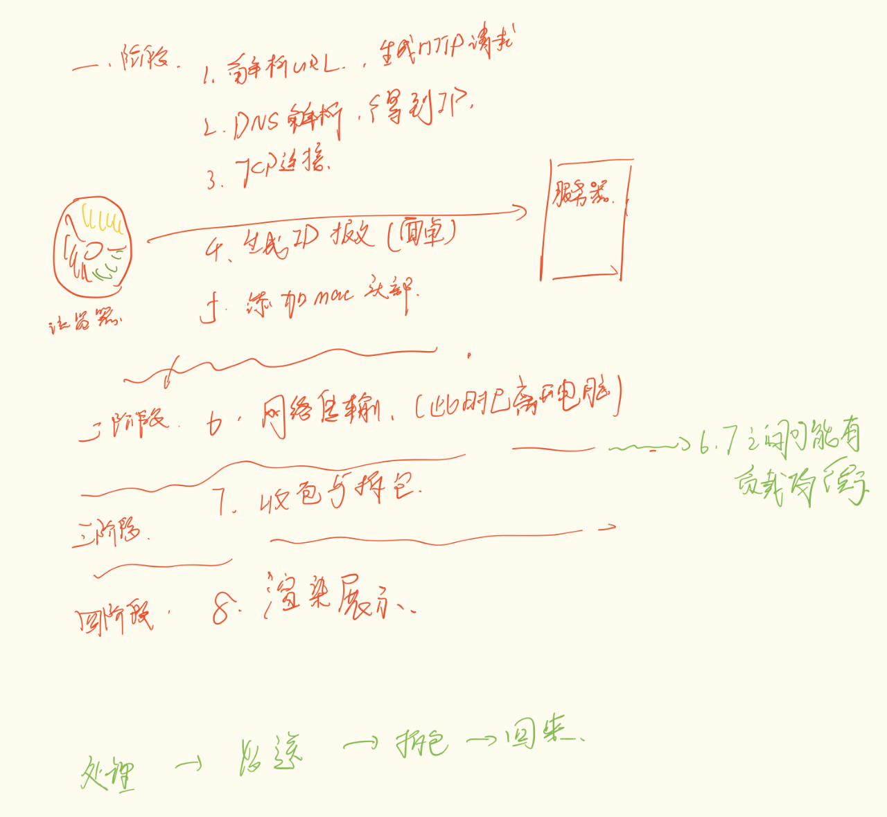 服务器响应:应用服务器处理业务(查库、计算),生成 HTTP 响应,原路返回给客户端。