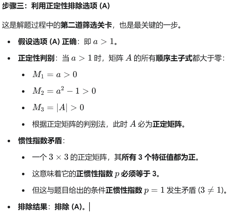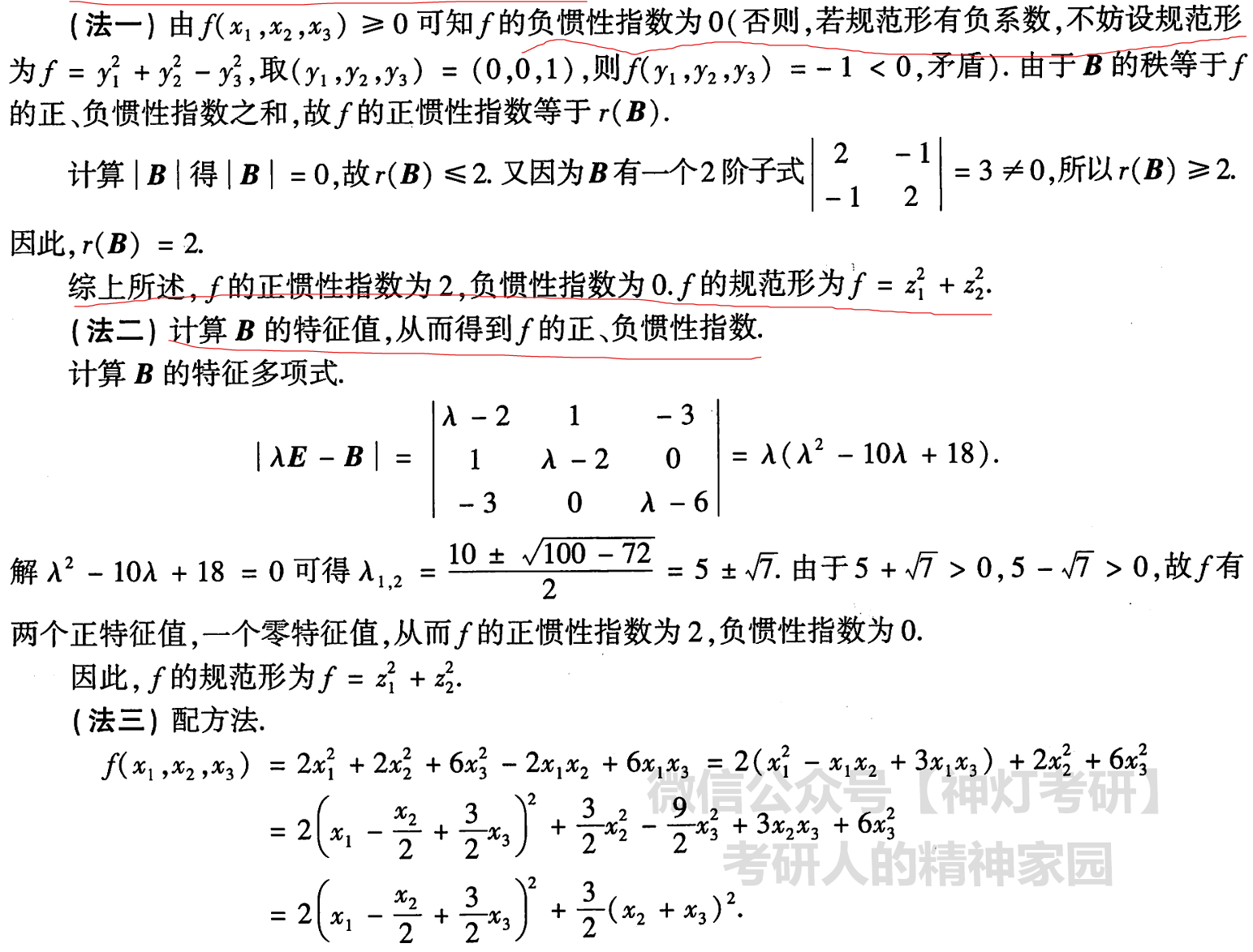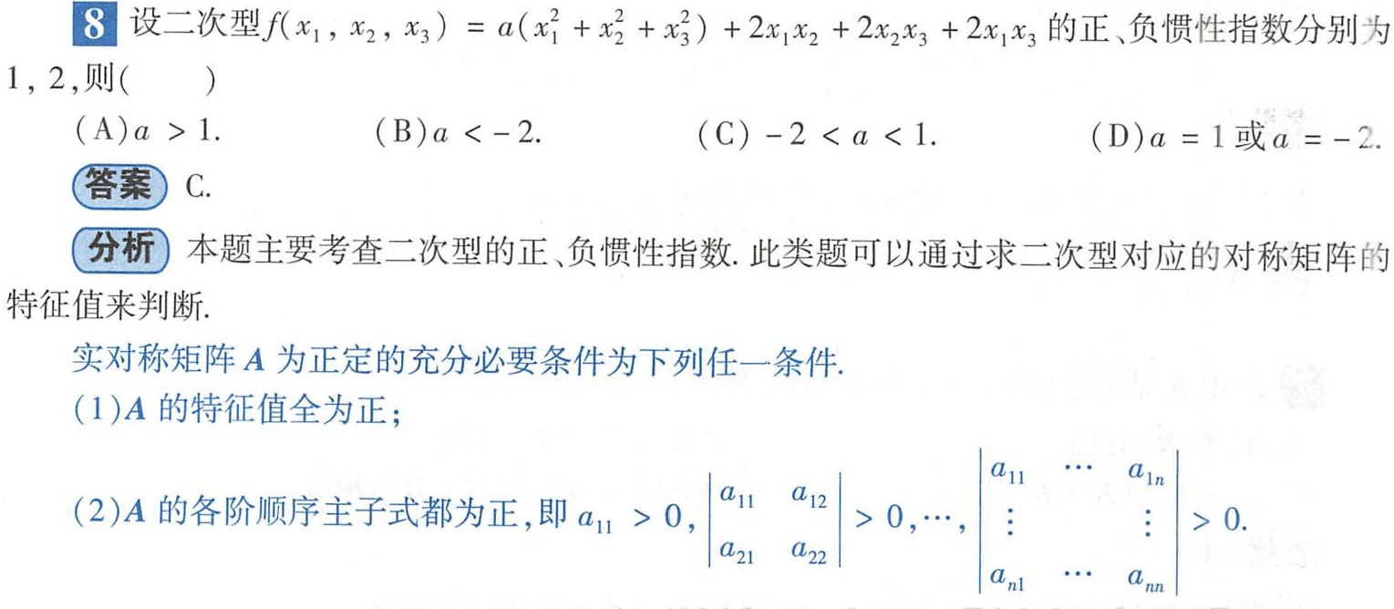 (充要条件): 两个实对称矩阵(或二次型)合同的充要条件是它们具有相同的正、负惯性指数(即相同的正特征值个数和负特征值个数)。