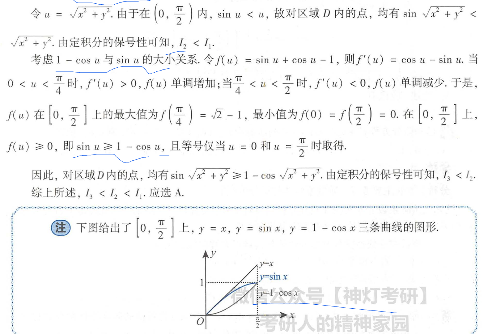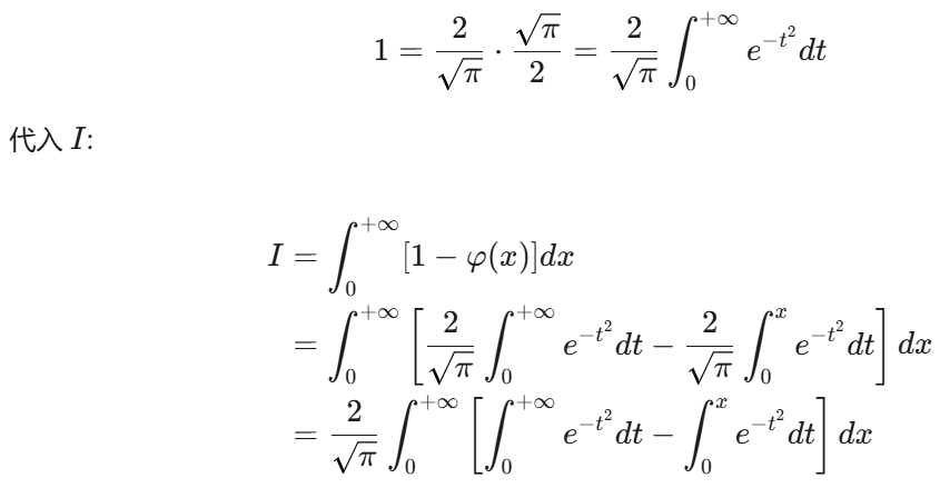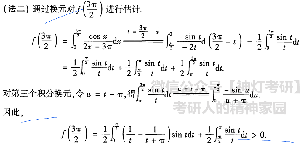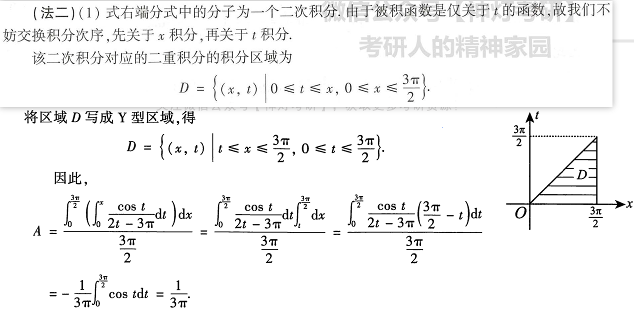 注第(I)问中的法一使用了分部积分法,比较巧妙.法二用到了交换二次积分的次序.这个想法也是比较自然的,符合我们简化计算的思想.一般地,对一个关于x,的二次积分来说,若被积函数是仅关于t的函数,则先对x积分,再对t积分能使计算简化。
