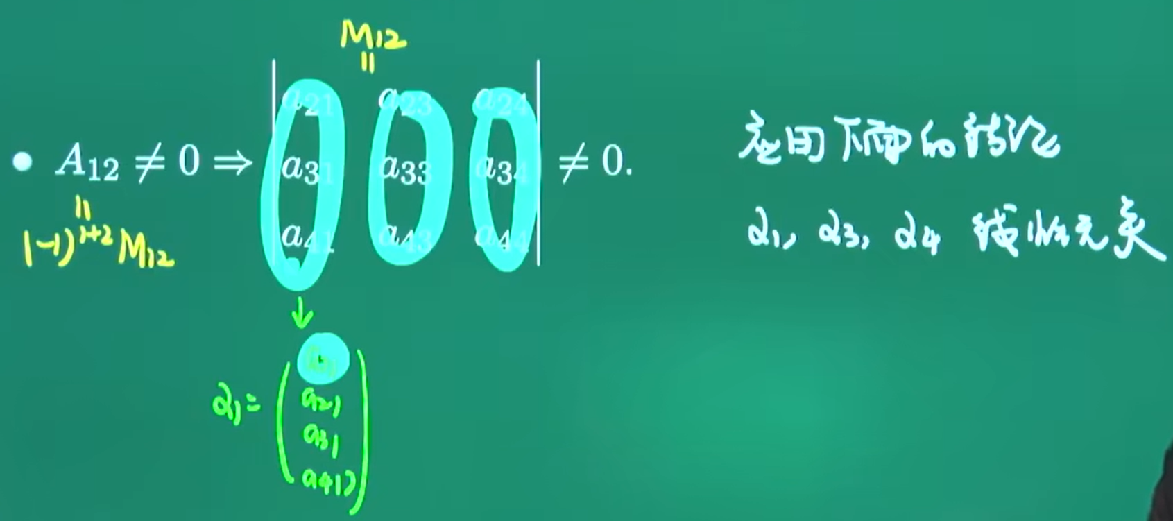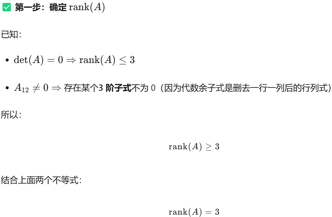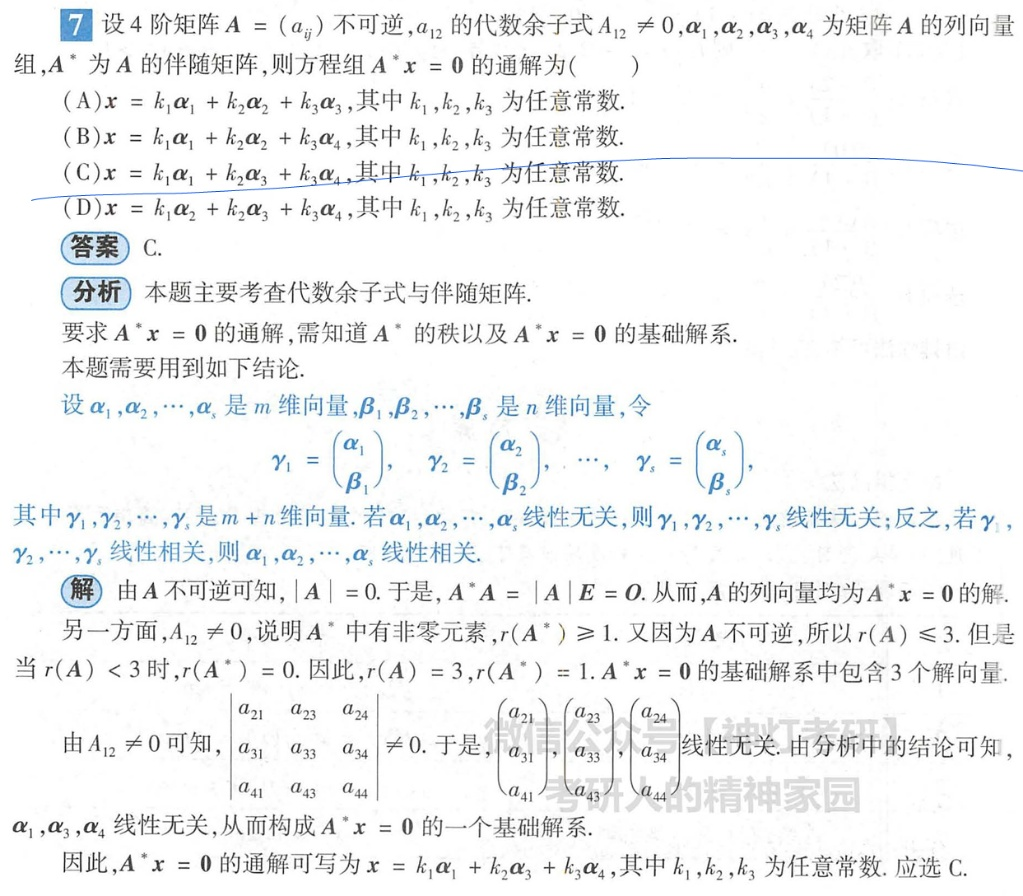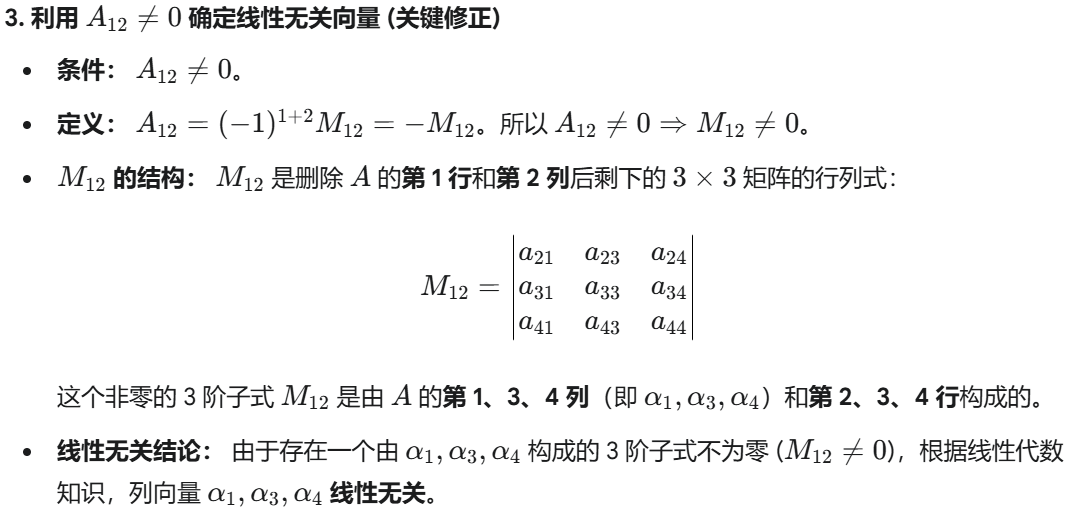 结论 A 的每一个列向量 αi 都是 A∗x=0 的解!我们需要从这 4 个解中找出 3 个线性无关的向量作为基础解系。