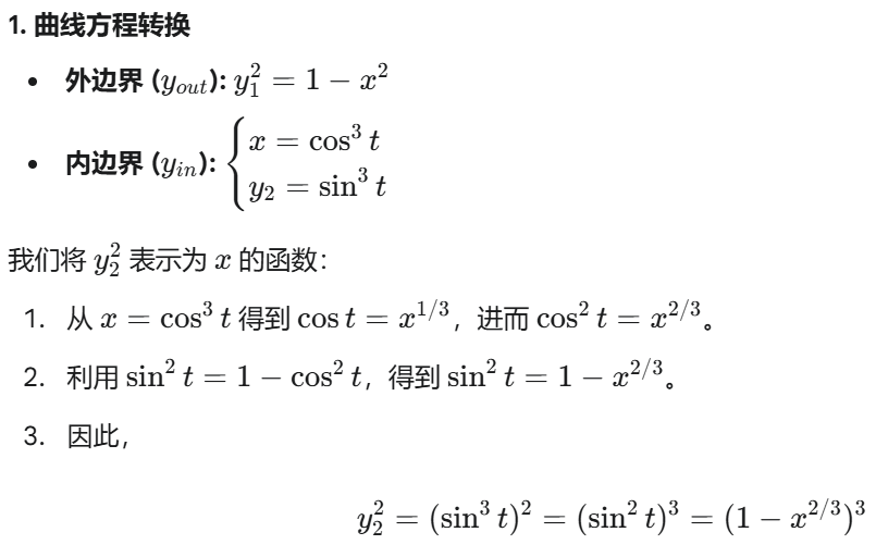当时想的f1-f2一步到位的算(但是不会曲线方程转换,同时也错了),答案是分开算体积相减法V1-V2。