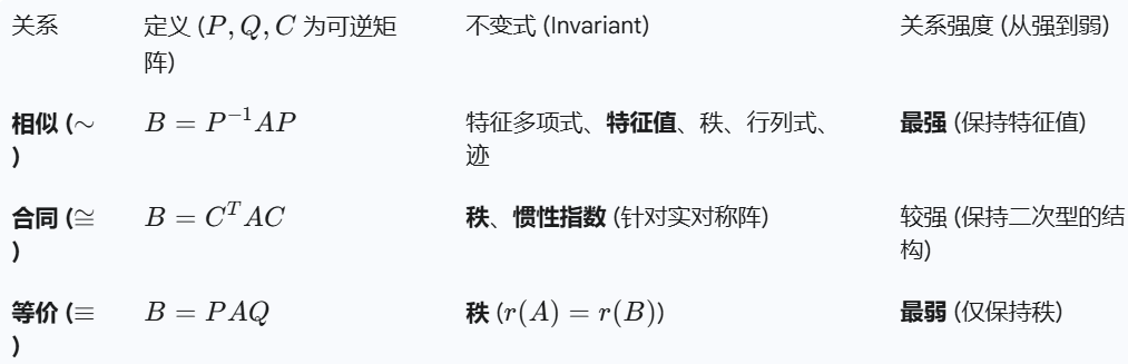 秩与相似: 相似矩阵的秩相等,合同矩阵的秩也相等。