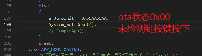 在之前的bootloader跳转流程中,我们需要上电后初始化bootloader所需外设, 然后读取判断APP_Flag,也就是ota状态是否等于0x00,然后跳转App,但是加入共享变量后,上电后读取共享变量的操作可以在bootloader外设初始化之前,也就是说,上电后检测共享变量,然后立即跳转,无需初始化外设,跳转前也无需"deInit"。(这里描述的是将共享变量存在flash中的情况,flash中掉电不丢失,可以标志App状态,然后做到上电立即跳转,本次的流程/代码修改中先将共享变量存在SRAM中)