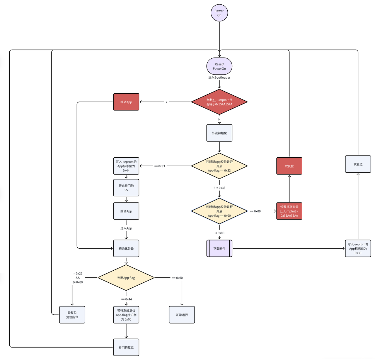 为有效规避此类风险,我们引入软复位机制。软复位具有独特的优势,它能够清除除特定寄存器外的所有寄存器值,从而促使单片机恢复至默认初始化状态。在这种情况下,Bootloader无需在初始化外设之后才进行跳转操作,而是可以在初始化外设之前直接跳转。如此一来,当跳转至应用程序(App)时,便无需再次执行重新初始化的逻辑,这不仅简化了操作流程,还提升了系统的整体效率和稳定性。