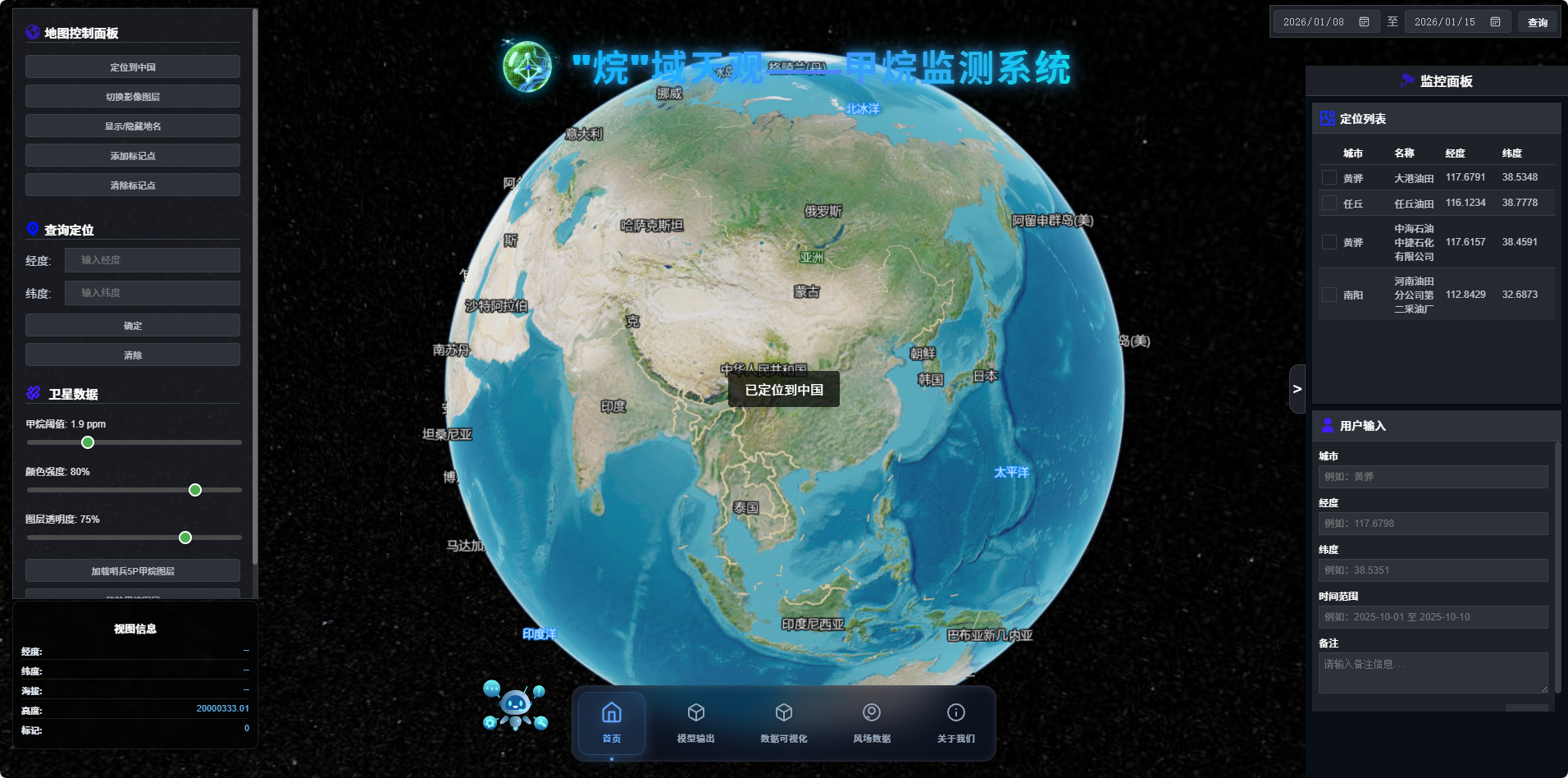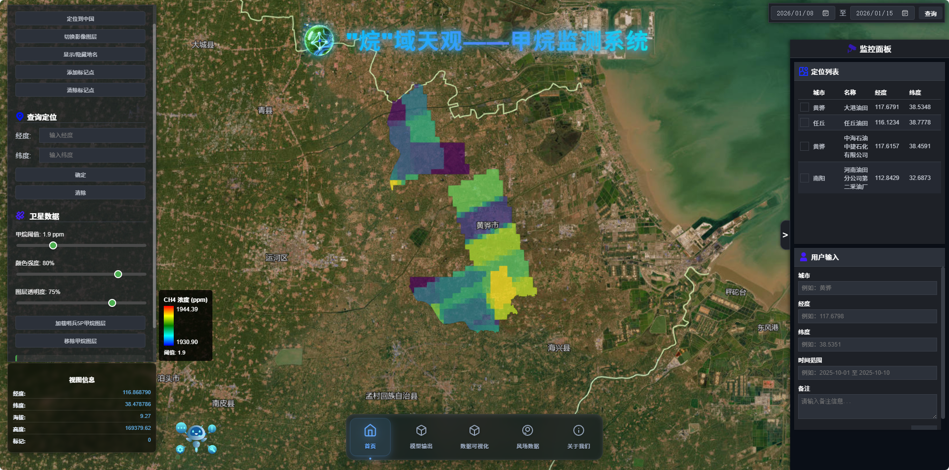 "烷"域天观------甲烷监测系统 是一套基于卫星遥感数据、深度学习与 Web 三维可视化技术的综合监测平台,面向油气田等重点区域开展甲烷排放监测与辅助分析。