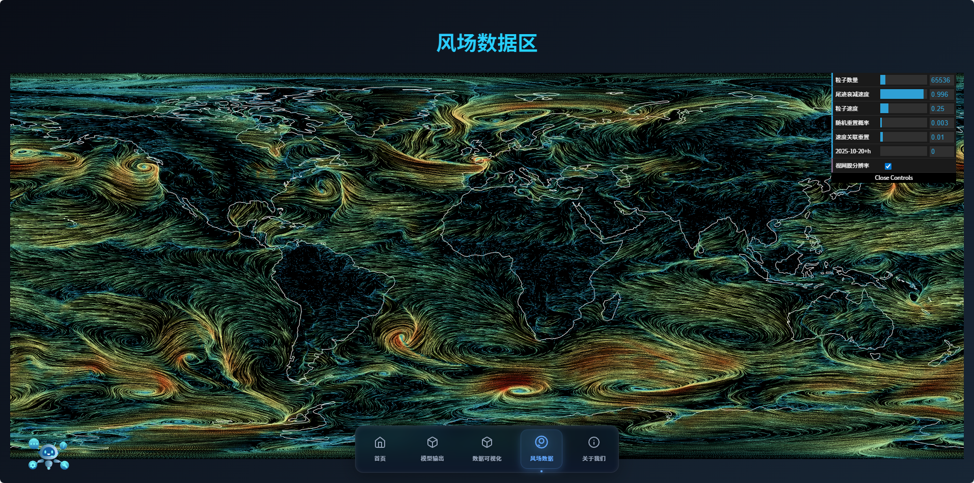 风场模块采用 WebGL 粒子流的方式展示全球或区域的风向与风速,背景是深色底图,粒子在地球表面飞舞,形成类似"流线云图"的视觉效果。