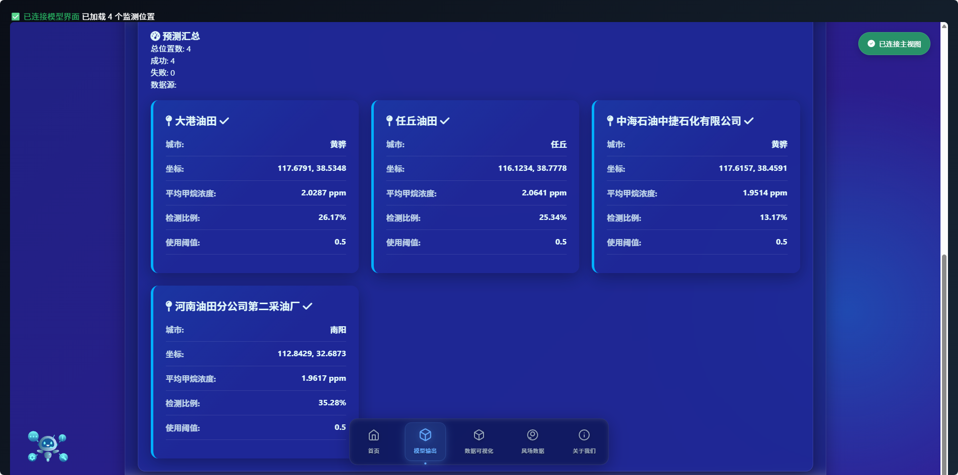针对典型油田与重点企业,系统设计了独立的预测模型界面,用于展示单点和多点的甲烷排放指标。