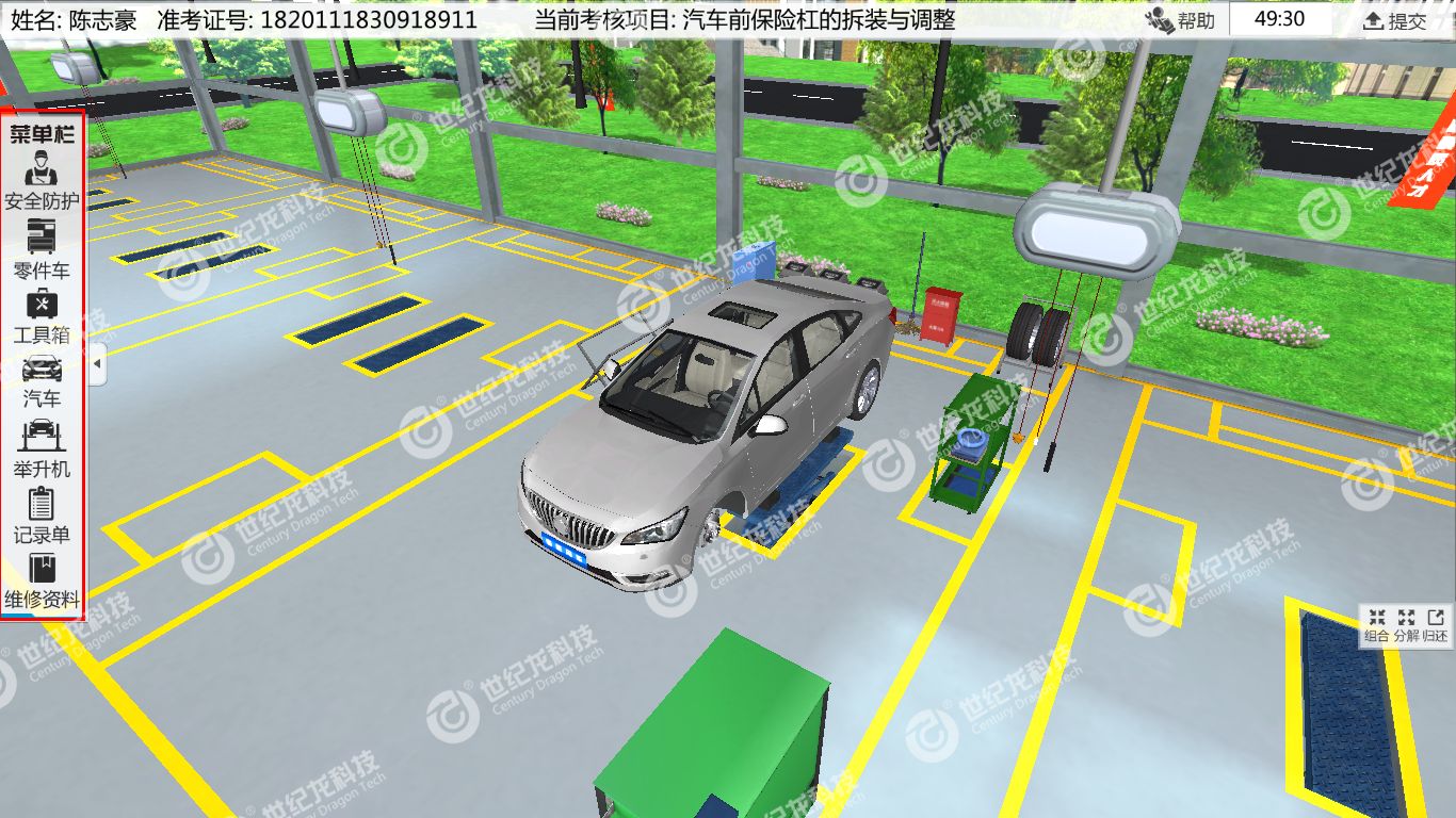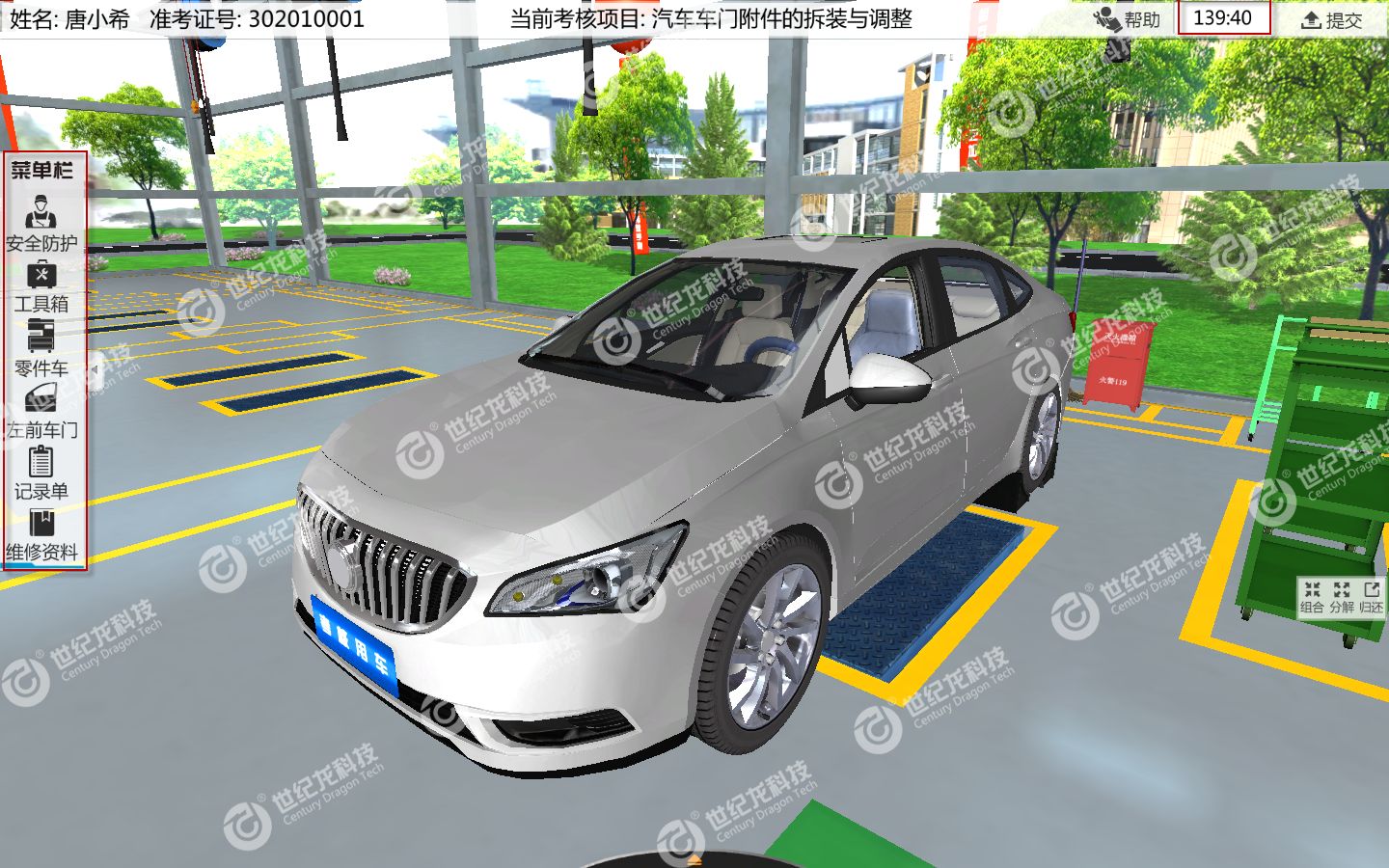 平台涵盖了汽车前保险杠拆装与调整、车门附件拆装与调整等常见实训模块,并支持模块考核、测量工具使用、维修资料查询等多重功能。学生可通过鼠标自由旋转、平移视角,实现对三维场景的全方位观察与交互操作。工具系统支持组合使用、旋向与力矩设置,同时兼顾作业现场的整理与清洁环节,全面培养学生的规范意识和职业习惯。