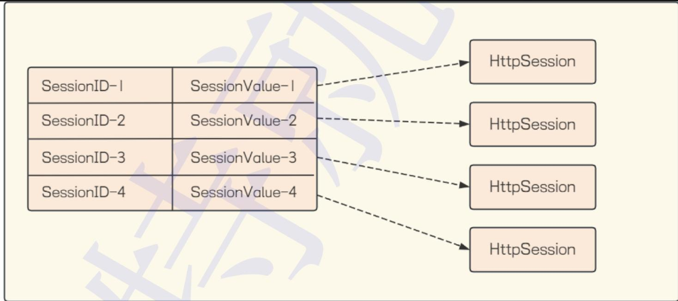 在 setSession() 方法里看不到 SessionID,是因为框架帮我们封装了细节。当客户端发请求时,getSession() 方法会自动从请求的 Cookie 里提取 SessionID,再到这个映射表里找对应的记录,最终拿到对应的 HttpSession 对象,这样就能用会话数据了。