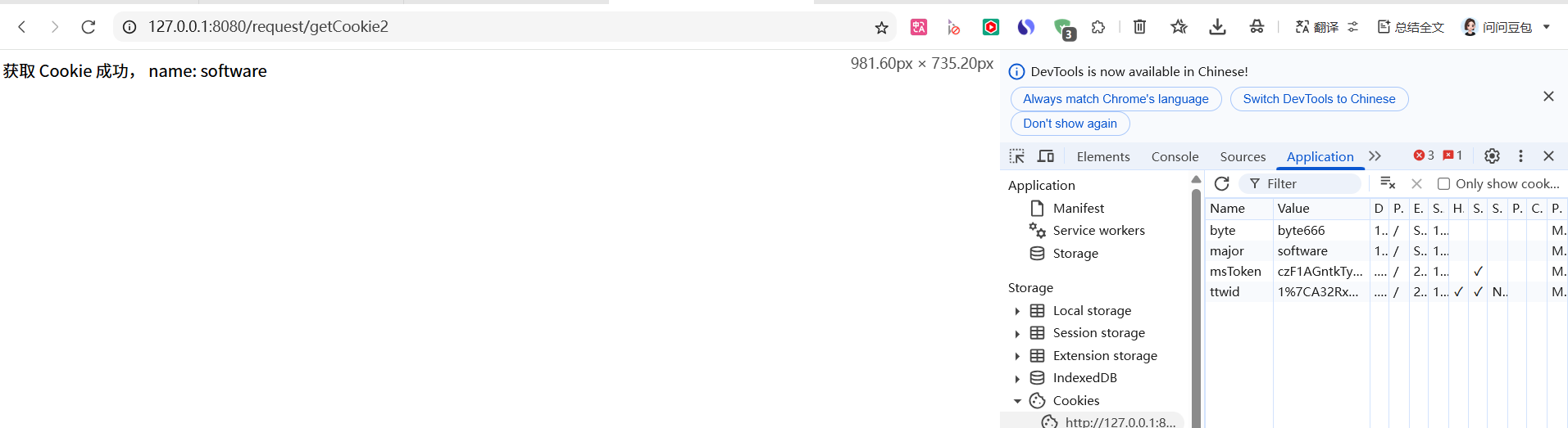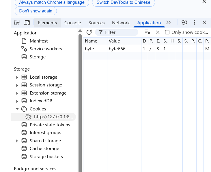 此时没有设置 Cookie,我们按下 F12 即可自动添加。从这个例⼦中,也可以看出 Cookie 是可以伪造的,也就是不安全的。所以使⽤Cookie时,后端需要进行 Cookie 校验。