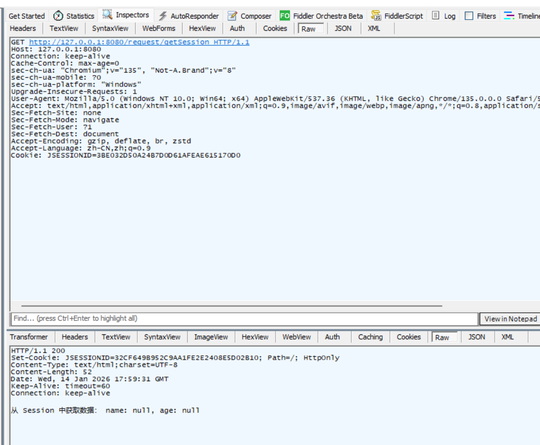 通过Fiddler观察Http请求和响应情况:可以看到,Http响应中,通过Set-Cookie告知客户端, 把 SessionID 存储在 Cookie 中。