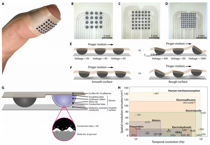 作者成功开发了Voxelite------一种基于高密度软电粘附执行器阵列的可穿戴触觉显示器,实现了与人类指尖感知极限相匹配的高空间分辨率(最高110节点/平方厘米)与高时间带宽(可达800赫兹)。其独特的"触觉透明"特性与柔软、轻薄的形态,使其能够在主动渲染虚拟触感与被动透传真实触觉之间无缝切换,为人机交互带来了前所未有的真实感与沉浸感。展望未来,Voxelite为构建真正"人类分辨率"的触觉交互奠定了关键的平台基础。首先,它有望推动虚拟现实、增强现实及元宇宙体验的质的飞跃,使用户不仅能"看到"、"听到",更能真切地"触摸"到虚拟物体与纹理。其次,在远程操作与遥操作机器人领域,该技术可实现高保真的力触觉反馈,极大提升操作精度与安全性。此外,在辅助技术方面,它能为视障人士提供高分辨率的环境轮廓触觉导航,或用于数字触觉通信。下一步研究将致力于实现系统的无线化与多指覆盖集成,探索个性化校准与长期佩戴的舒适性方案,并深入研究最优的节点排布与编码策略,以进一步提升触觉的真实感与通信效率。最终,Voxelite所代表的技术路径,将有力推动触觉数字化进程,模糊物理世界与数字世界之间的感知边界。