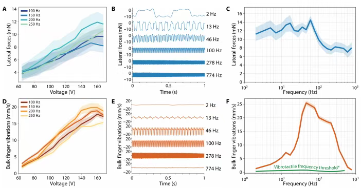 图3:展示了VoxeLite的时间分辨率特性,通过实验验证了其在不同频率下的力响应和振动感知能力。