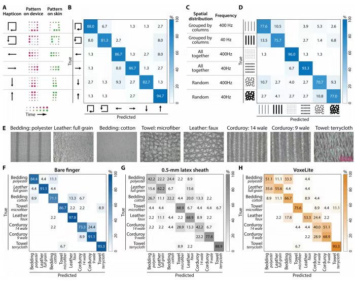 图5:总结了用户实验结果,证明了VoxeLite在传递小尺度触觉图标和虚拟纹理方面的有效性,以及在真实触觉信息传输中的透明性。