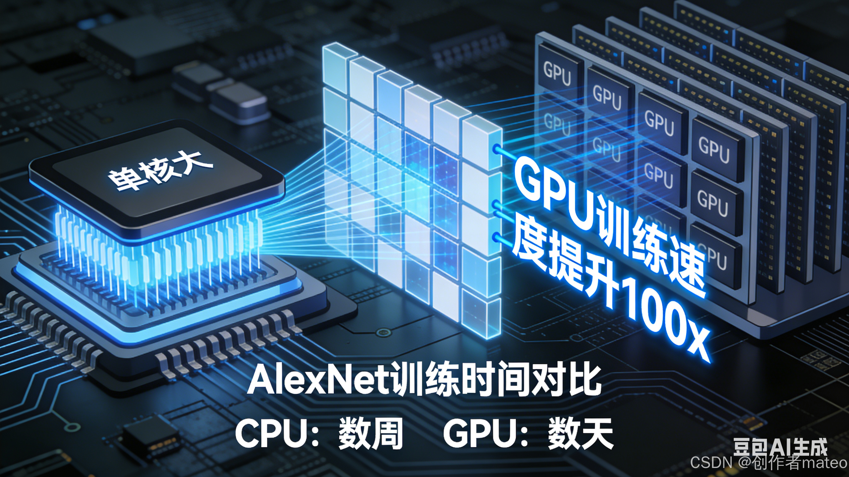 - 2009年:GPU开始被用于加速深度学习计算。相比CPU,GPU的并行计算能力可将训练速度提升数十倍,彻底打破了深层网络的算力瓶颈。
