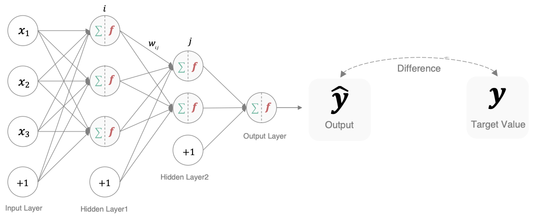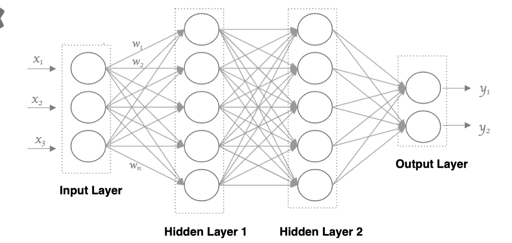 - 隐藏层(Hidden Layers): 输入层和输出层之间都是隐藏层,神经网络的"深度"通常由隐藏层的数量决定。隐藏层的神经元通过加权和激活函数处理输入,并将结果传递到下一层。