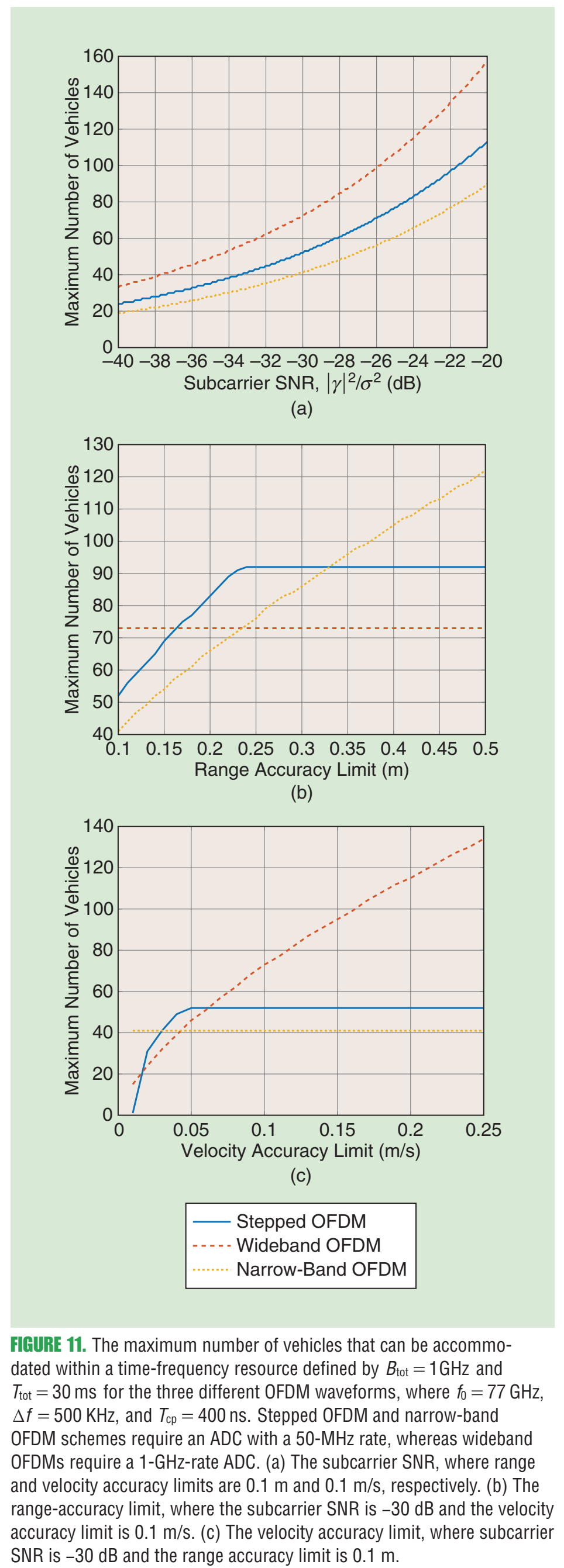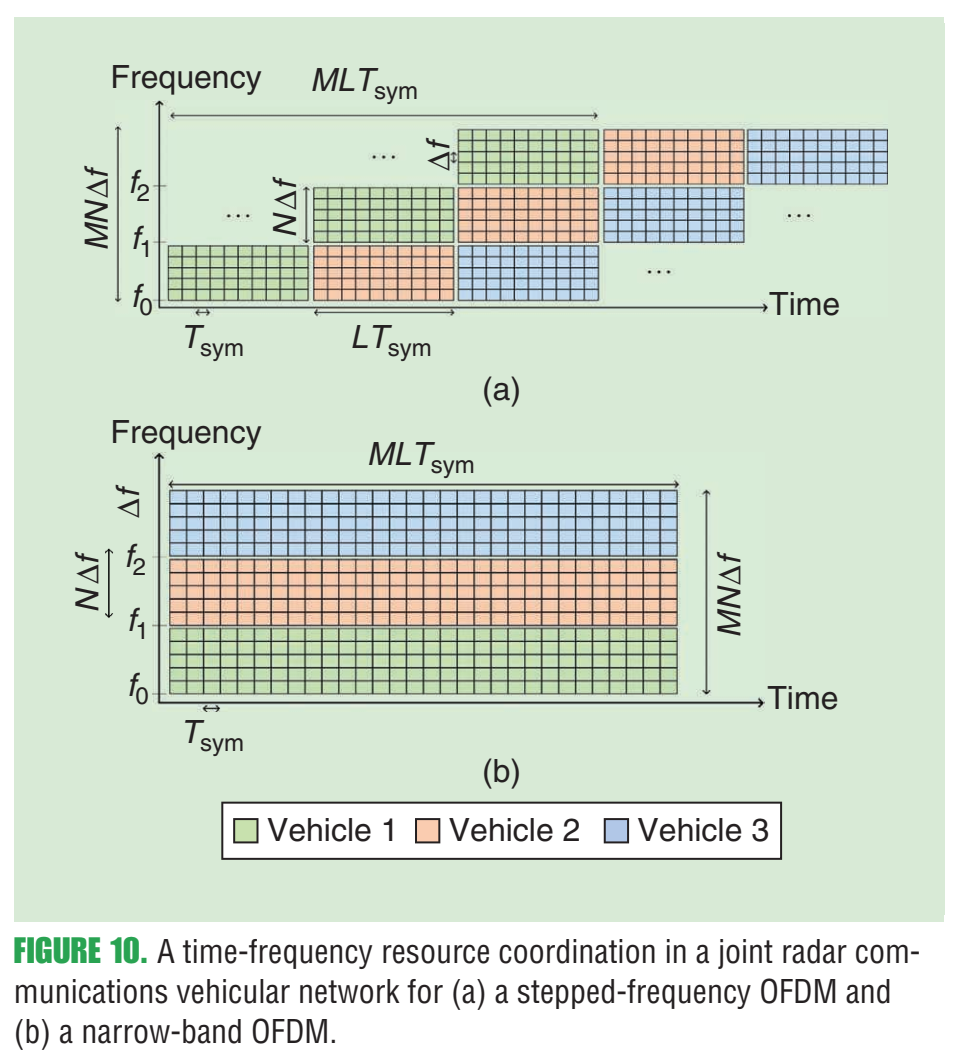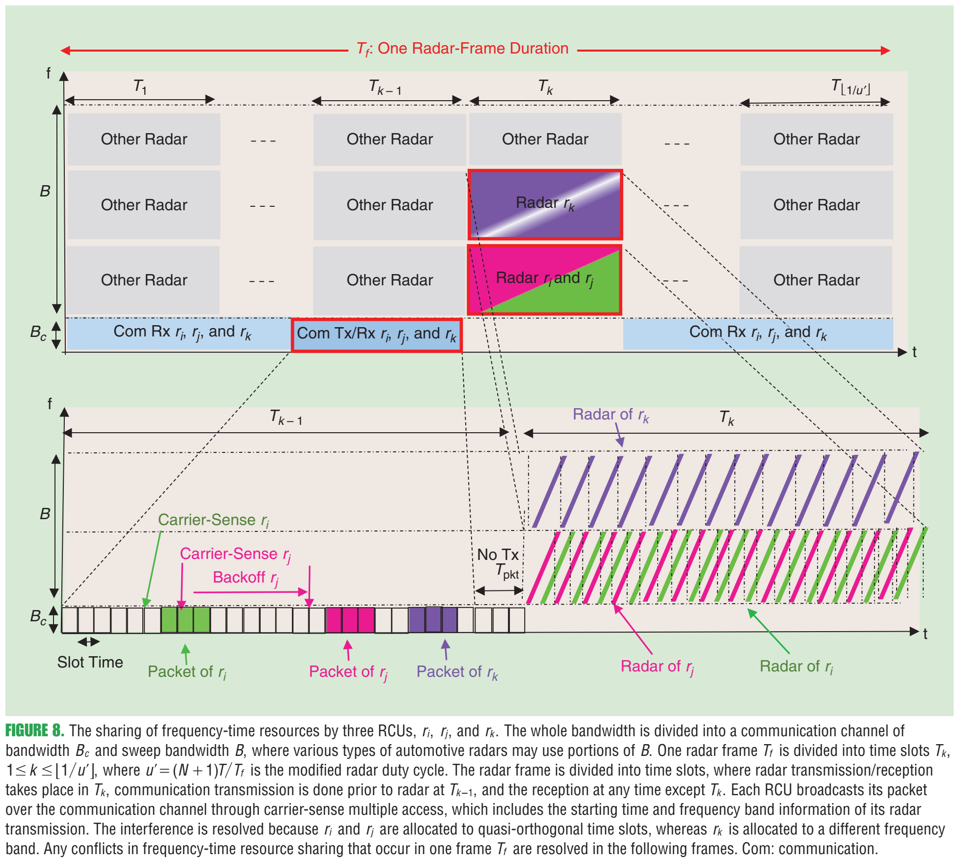 (原文把"不可控因素"和"可控因素"分开强调:第一因子多由场景决定,第二因子可通过占空比、chirp斜率、FOV、处理增益等优化,使SIR远大于1。) 这里已经埋下后文三种主动策略的逻辑:**降低 fff** 、降低有效斜率 aaa 或通过资源分离让"相干叠加"变得不可能,同时保持足够的距离/速度分辨率。 *** ** * ** *** ### 9. 主动策略一:准正交FMCW波形(图7、式(12)及其后推导) 作者从前面的分析得到一个干净的比例关系:干扰与 fu∝a xmax uB f_u \\propto \\frac{a\\,x_{\\max}\\,u}{B} fu∝Baxmaxu 相关(uuu 为占空比,xmaxx_{\\max}xmax 为最大往返时延),因此 **降低chirp斜率 a=B/Ta=B/Ta=B/T** (等价于延长chirp)能显著降低干扰。 #### 9.1 两个错位chirp的耦合(式(12)) 考虑一个chirp x(t)x(t)x(t) 与时间错位 TxT_xTx 的chirp x(t−Tx)x(t-T_x)x(t−Tx)(并以周期 TTT 重复),它们的功率泄漏/耦合(本质上是相关积分): ρx(Tx)=∣1T∫0Tx(t) x∗(t−Tx) dt∣2≈∣sin (πBTTx2)πBTTx2∣2, \\rho_x(T_x)=\\left\|\\frac{1}{T}\\int_0\^T x(t)\\,x\^\*(t-T_x)\\,dt\\right\|\^2 \\approx \\left\|\\frac{\\sin\\!\\left(\\pi \\frac{B}{T}T_x\^2\\right)}{\\pi \\frac{B}{T}T_x\^2}\\right\|\^2, ρx(Tx)= T1∫0Tx(t)x∗(t−Tx)dt 2≈ πTBTx2sin(πTBTx2) 2, 并指出由于瞬时频差约为 BTTx\\frac{B}{T}T_xTBTx,所以这种耦合像"两正弦频差"的互相关一样迅速衰减,从而称这些波形为**准正交**。 #### 9.2 图7:单慢扫频(slow-sweep) FMCW实现"很多近似正交信号"  **图7内容**:这是一个"把慢扫频FMCW落地到硬件链路"的简化方案。LFM基带可数字生成,上变频后发射;接收端下变频得到基带后以约50 MHz带宽采样;强泄漏在数字域表现为直流分量,通过"dc消除/反馈抵消"而非极低截止频率的模拟高通来处理;同时允许在数字域做相位偏置(Doppler adjust)以改变不模糊速度范围。原文图注强调该方案"允许许多正交信号",并解释了DAC/ADC/直流消除等关键模块。 #### 9.3 "长chirp"下的速度-距离解耦(式(13)(14)的意义) 作者指出式(5)里把速度当作简单多普勒近似会忽略小项,但在长chirp下必须保留,从而可在单chirp内解决range-speed ambiguity。文中写出更严格的形式(结构上是"相位含二次项的积分")并用频域峰值与相位单调性做数值反演来求速度。 *** ** * ** *** ### 10. 主动策略二:借助低速通信做"频时资源协调"(图8、图9) 这部分作者把雷达当作"可被调度的发射机",通过低速通信在车与车之间交换起始时间/频带等信息,使雷达在频时资源上尽量正交。文章提到可以用专用通信或蜂窝V2X,甚至把雷达与通信融合成RadCom单元。 #### 10.1 图8:RCU的频时共享与冲突消解机制  **图8内容解读** :上半部分展示一个雷达帧 TfT_fTf 被切成时间槽,车载RCU在通信带宽 BcB_cBc 上广播自己的"雷达资源占用",从而把不同车辆的雷达chirp安排到准正交的时间槽;若某车被分配到不同频带,则通过频分避免冲突。下半部分展示载波侦听/退避的通信过程与"下一帧再消解冲突"的思想。原文图注还解释了 ri,rj,rkr_i,r_j,r_kri,rj,rk 三个RCU:前两者用准正交时间槽,第三者换频带,且帧内冲突可在后续帧消解。 #### 10.2 图9:协调前后干扰概率 fff 的数量级差异  **图9内容解读** :横轴为RCU(雷达/通信单元)数量,纵轴为干扰概率 fff(对Monte Carlo取期望意义)。图中"Coordination"曲线显著低于"No Coordination",说明只要能在几十毫秒级做资源分配更新,干扰概率能大幅降低。原文图注给出仿真条件:一个帧20 ms、1 GHz带宽、Bs=50B_s=50Bs=50 MHz、T=20T=20T=20 ns、fc=79f_c=79fc=79 GHz、K=99K=99K=99、10,000次Monte Carlo等。 *** ** * ** *** ### 11. 主动策略三:RadCom / OFDM,尤其是"跳频的 stepped-frequency OFDM"(图10、式(15)、图11) 作者指出OFDM作为通信主力波形,天然适合做"雷达+通信"融合(RadCom)。难点在于常规OFDM雷达受ADC带宽限制,分辨率不如宽带FMCW;解决思路是用**stepped-frequency OFDM**:连续OFDM帧在不同载频上发射,拼接成更大的总带宽,同时每帧仍保持较小的基带带宽,从而降低ADC速率。 #### 11.1 图10:时间-频率资源协调示意(stepped vs narrow-band)  **图10内容解读** :图10(a)显示stepped-frequency OFDM:不同车辆被分配到互不重叠的时频块(不同载频/不同时间段),每个车辆通过跨M个载频帧的联合处理获得总带宽 MNΔfMN\\Delta fMNΔf 的高距离分辨率;图10(b)为窄带OFDM的资源分配。原文图注明确这是"time-frequency resource coordination in a joint radar communications vehicular network"。 #### 11.2 OFDM回波数据立方体模型(式(15)) 在"循环前缀长于时延、且小多普勒近似"等标准假设下,作者给出第 mmm 帧、第 ℓ\\ellℓ 个符号、第 nnn 个子载波上的接收符号模型 ##