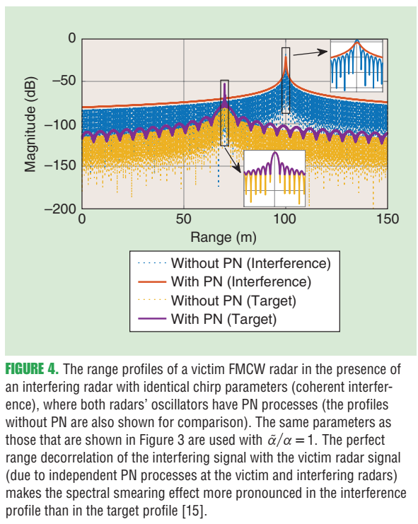 图4内容:考虑振荡器相位噪声(PN)后,无论目标回波还是干扰谱都会"涂抹/展宽",但由于干扰更强,这种谱展宽会更显著地恶化检测性能,尤其会遮蔽弱目标。原文图注指出这里讨论"相干干扰"场景,并对比"有/无PN"两种情况。