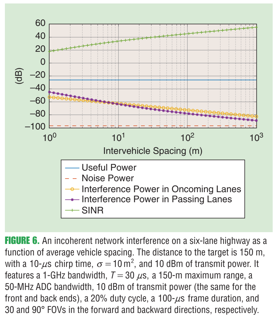 图6内容:横轴是平均车距(越小表示越拥挤),纵轴展示 useful power、noise power、来自对向车道/超车车道的干扰功率,以及合成后的SINR。随着车距减小,干扰项迅速上升,SINR大幅下降;作者还给出实验/仿真设定,例如目标距离150 m、带宽1 GHz、占空20%、不同FOV等。