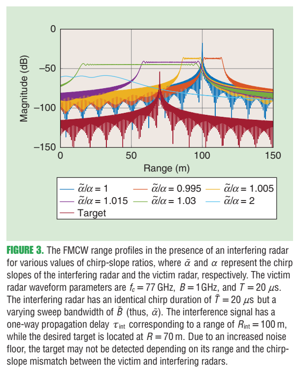 图3内容 :受害雷达的距离谱在存在干扰雷达时,随斜率比 a~/a\tilde a/aa~/a 改变而出现明显差异:当斜率匹配程度不同,干扰在距离轴上的"形态"不同,可能形成局部峰值、也可能把噪底整体抬高,从而掩盖弱目标或引入虚假峰。原文说明参数如 fc=77f_c=77fc=77GHz、B=1B=1B=1GHz、T=20 μsT=20\,\mu sT=20μs 等,并强调干扰是单程传播而目标是双程传播。